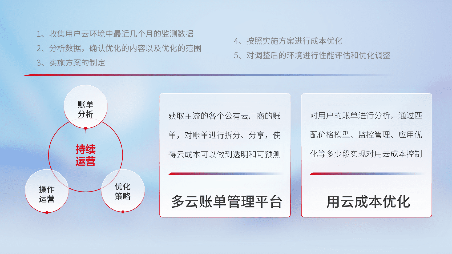 通过多云纳管,,以统一的资源数据模型把客户的云资源进行抽象和封装,,,,进而实现对多云资源的统一操作,,保障云资源管理的可靠性、、、稳定性与可用性。。量身定制化运维内容,,,,配置、、开发运维、、、补丁管理、、备份、、监控、、认证和访问管理、、审计和日常巡检等,,,,保障在用云过程中的可靠度,,稳定度以及高可用率。。。。